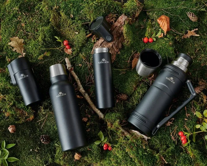 Powłoka „powder coating” w klasycznym czarnym kolorze zapewnia wyjątkową ochronę przed zarysowaniami i uszkodzeniami mechanicznymi, podkreślając solidność konstrukcji. Wyprofilowany otwór w formie lejka ułatwia nalewanie i picie, co podnosi komfort na każdym etapie podróży.