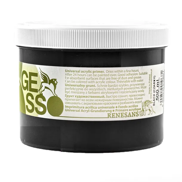 Dostępne w kolorze czarnym gesso stanowi mocny akcent pod warstwy malarskie lub kolażowe. Można je również mieszać z farbami akrylowymi, by uzyskać barwiony podkład i dopasować tło do planowanej kompozycji.