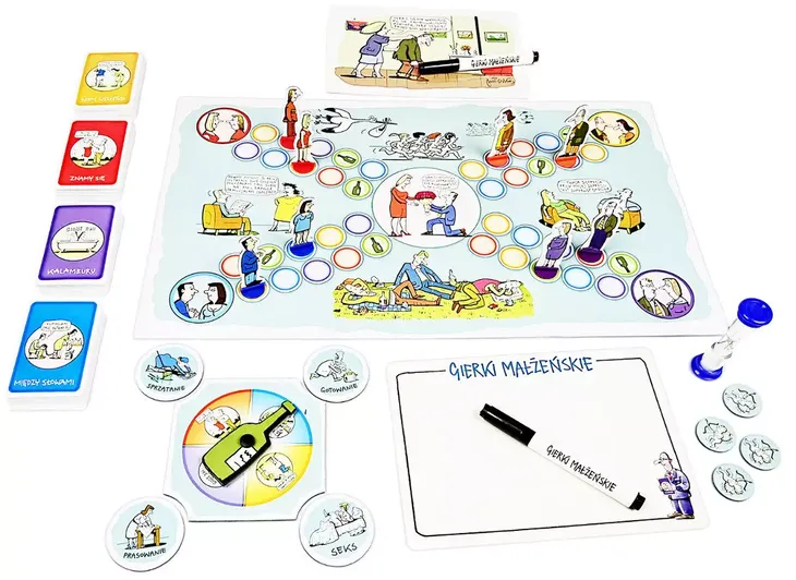 Gra dla par z ilustracjami Andrzeja Mleczki• Wiecie o sobie wszystko?• Jesteście parą idealną?• Porozumiewacie się bez słów?• Czy tworzycie zgrany zespół?Sprawdźcie się w rozmaitych zadaniach i porównajcie z innymi parami. Udowodnijcie sobie nawzajem, że jesteście dla siebie stworzeni.Przed wami dziesiątki zadań i wyzwań, którym możecie stawić czoło tylko we dwoje!W „Gierkach Małżeńskich” będziecie przesuwać swoje pionki po planszy, wchodząc po kolei na pola z zadaniami losowanymi z czterech talii kart. Za rozwiązywanie zadań otrzymacie żetony kupidyna. Wygrywa para z największą pulą żetonów.Zadania wykorzystują schematy popularnych zabaw towarzyskich. Mamy talię z wyzwaniami w stylu Taboo (opisywanie słowa do zgadnięcia bez użycia słów kluczowych), kalambury (rysowanie haseł do odgadnięcia), testy znajomości dla par (odgadnięcie zachowania partnera w konkretnej, przedstawionej sytuacji) oraz quiz wiedzy ogólnej.