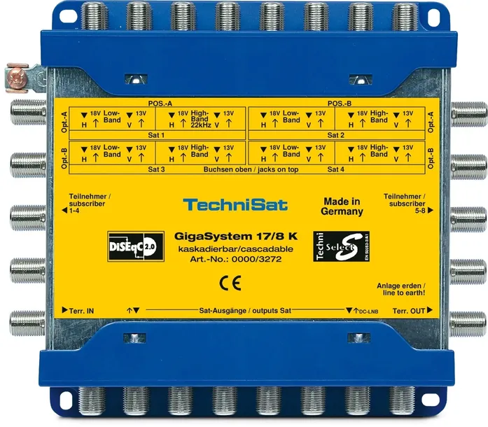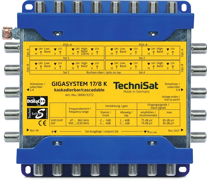 GigaSystem 17/8G - to jednostka bazowa posiadająca, aż 16 wejść-IF. Dzięki, którym istnieje możliwość jednoczesnego podłączenia czterech konwerterów Quatro LNB. Dodatkowo posiada pełnozakresowe wejście sygnału naziemnego. Sygnał może zostać rozesłany do 8 użytkowników.