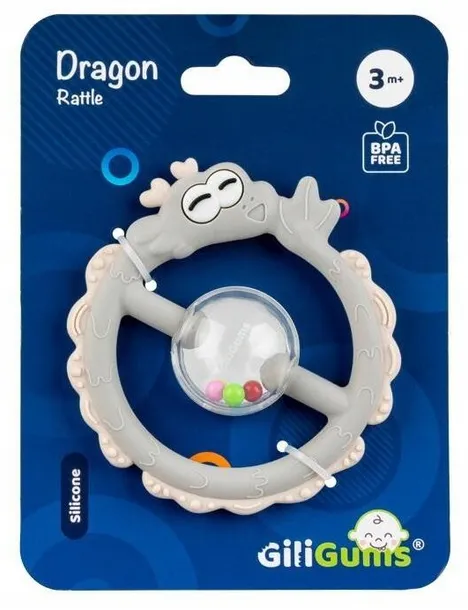 Smocza zabawka dla ząbkujących poszukiwaczy wrażeń łączy w sobie walory gryzaka i grzechotki! Całą powierzchnię obręczy zdobią zróżnicowane wypustki, które podczas gryzienia będą delikatnie masować dziąsełka malucha. Dostosowany do małych rączek kształt zabawki, ułatwi maluchowi jej chwytanie. Wewnątrz smoka znajduje się kula wypełniona kolorowymi kuleczkami, które grzechoczą przy potrzą przeznaczony jest dla dzieci od 3 miesiąca życiaCechy produktu: grzechotka; zróżnicowane faktury; wiek: 3m+.
