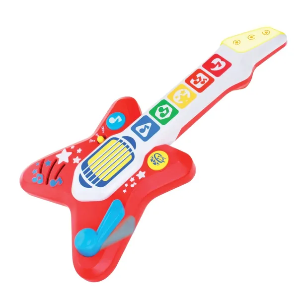 Daj się porwać magii dźwięku i graj na gitarze jak prawdziwa gwiazda rocka! Zabawka do złudzenia przypomina pełnowymiarowy instrument muzyczny. Znajdziemy tu gryf z dotykowymi przyciskami oraz wajchę, która podkręca dźwięk, przenosząc grę na zupełnie inny wymiar! Do wybory mamy 2 tryby zabawy oraz regulację głośności, dzięki czemu dostosujemy zabawkę do indywidualnych potrzeb małego gitarzysty. Grze na instrumencie towarzyszą migające światełka.Zabawka przeznaczona dla dzieci od 18 miesiąca życia.Cechy zabawki:- dźwięki - 2 tryby zabawy- regulacja głośności- migające światełka- dotykowe przyciski - ruchomy mostek (wajcha) do podkręcenia dźwięku- wiek: 18m+