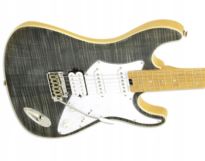 Gitara elektryczna 6-strunowa Aria Pro II 714-MK2 - Fullerton. Korpus: topola. Top: klon wzorzysty. Gryf: klon „opiekany” - Roasted Maple. Podstrunnica: klon „opiekany” - Roasted Maple. Typ łączenia z korpusem: wkręcany – Bolt-on. Ilość progów: 22. Skala instrumentu: 648 mm. Przetworniki w układzie: HSS OS-5 Single coil x 2, CPH-1 Humbucking x 1.Potencjometry: volume, Tone, 5-way PU Selector SW, Coiltap SW x 1(Push/Pull Coil-tap on Tone Knob). 5- pozycyjny przełącznik przetworników. Mostek ruchomy: Wilkinson. Osprzęt chromowany. Płytka maskująca: biała perłowa - Perloid Pickguard. Kolor: czarny - BKDM (Black Diamond).