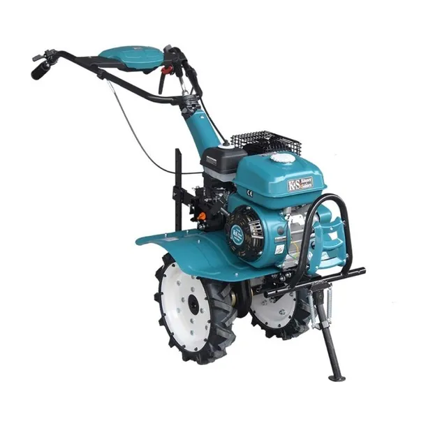 Glebogryzarka benzynowa KS 7HP - 950S firmy «Könner & Söhnen» to praktyczny, niezawodny i wielofunkcyjny rolniczy agregat. Jest to przetwarzanie gleby o różnej gęstości, sadzenie roślin, zbieranie plonów, podkurczanie. Maksymalna szerokość przetwarzania to 108 cm. Unikalna konstrukcja jest wykonana z wykorzystaniem współczesnych technologii, kompaktowe rozmiary i stylowy wygląd. Ergonomiczny panel sterowania jest regulowany w pionie o 180 °, co ułatwia obsługę, wykonywanie manewrów roboczych, a także sprawia, że glebogryzarka jest kompaktowa podczas przechowywania. Dla większej wygody, glebogryzarka jest wyposażona w skrzynkę narzędziową. Przekładnia łańcuchowa przenosząca do 95% momentu obrotowego sprawia, że glebogryzarka jest wytrzymała, niezawodna i gotowa do dużych obciążeń. Kute noże pasują dla użycia z każdym typem gleby. Można je montować i instalować na dwa sposoby: po 3 i po 4 noży w grupie. W komplet wchodzą pneumatyczne koła KS RW40 (4.00-8″), że ułatwiają transportowanie urządzenia i jakiegokolwiek ładunku z nim. Glebogryzarka jest wyposażona w skrzynię biegów z 2 prędkościami do przodu i jedną wstecz, która zapewnia łatwą i wygodną kontrolę zarówno podczas obróbki gleby, jak i podczas używania przyczepy. Wytrzymały, ekonomiczny i ekologiczny czterosuwowy silnik z chłodzeniem powietrzem, przeznaczony dla długotrwałych robót i zabezpiecza wysoką wydajność. Małe wymiary glebogryzarki pozwalają dobrze manewrować nawet na małych ziemnych działkach. Dany model przewiduje ustawienie dodatkowego sprzętu ( pługi, kopaczka do ziemniaków, koła metalowe), możliwe jest zainstalowanie przyczepy do transportu ładunków. Wysokiej jakości części gwarantują długotrwałą eksploatację przy prawidłowym użytkowaniu i technicznej obsłudze.
