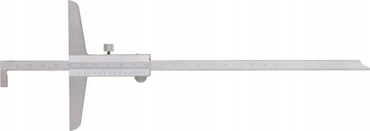 Wykonanie: ze stali nierdzewnej, hartowanej, noniusz chromowany matowo i obustronnie precyzyjnie grawerowany laserowo, dwustronna podziałka szyny pomiarowej, dzięki temu może być użytkowany jako normalny głębokościomierz, ze śrubą ustalającą.