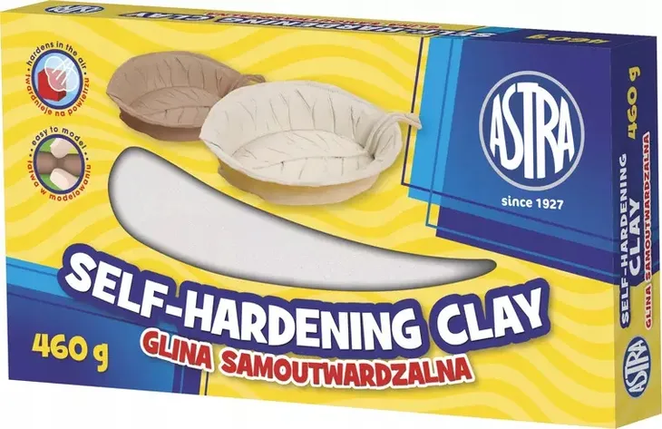 Glina samoutwardzalna jest gotową do użycia plastyczną masą, która twardnieje na powietrzu. Glina samoutwardzalna najlepiej nadaje się do wykonywania małych form rzeźbiarskich. Można z niej wykonać formy pełne typu: figurki, miski, talerze ozdobne, płaskorzeźby na płytkach oraz biżuterię (wisiorki, korale, broszki). Na gładkich powierzchniach można też bez trudu odciskać rozmaite wzory. Czas wysychania gotowych wyrobów zależy od ich grubości oraz warunków suszenia. W razie potrzeby dla uzyskania odpowiedniej konsystencji glinę należy zwilżyć wodą. Wykonane z gliny samoutwardzalnej przedmioty, po wyschnięciu można malować farbami Astra. Rozmiar opakowania: 18.0 x 10.0 x 2.0 cm
