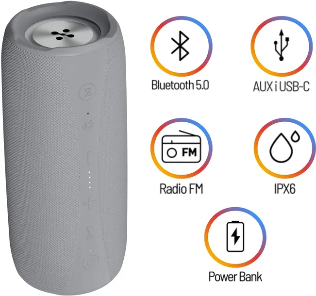 Przenośny głośnik bezprzewodowy o mocy 30W zapewnia mocne, czyste brzmienie oraz głęboki bas. Dzięki wodoodpornej konstrukcji doskonale sprawdzi się na plaży, w ogrodzie, na biwaku czy podczas imprez plenerowych.