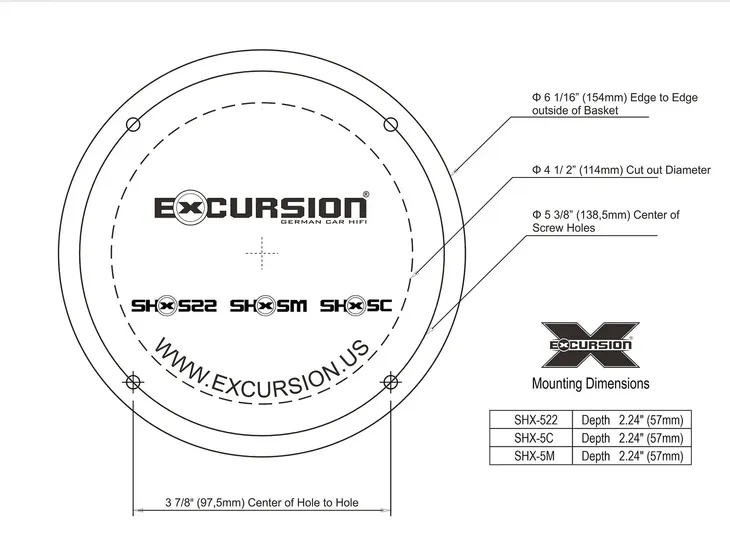 Samochodowe głośniki średnio-niskotonowe (mid-woofery) o średnicy 130 mm marki Excursion z serii SHX (Street High Power eXcursion). Głośniki z serii SHX, to bardziej zaawansowane brzmieniowo produkty o podwyższonej wydajności przeznaczone do uniwersalnych zastosowań oraz jako zamienniki fabrycznych systemów głośnikowych (OEM). W porównaniu do cieszących się bardzo dobrą opinią głośników z niższej serii SX, mid-woofery SHX prezentują znacznie dojrzalszy i bardziej dynamiczny charakter brzmienia. Wyższa moc wzmacniacza przeważnie zawsze zapewnia lepszą kontrolą głośników. Z tego powodu impedancja cewek mid-wooferów SHX została obniżona do 3 Ohm. Jest to jeszcze akceptowalna wartość przez większość standardowych radioodtwarzaczy i dobre systemy fabryczne. Dzięki temu można efektywniej wykorzystać każdy wzmacniacz, nawet wbudowany w radioodtwarzaczu, uzyskując z niego dodatkowo ok. 25% więcej mocy, co w praktyce przekłada się na bardziej dynamiczne brzmienie.. Stożkowe membrany mid-wooferów wykonano z bardzo dobrego materiału, którym jest 2-warstwowy kompozyt papieru i naturalnej wełny z domieszką włókna szklanego. Sprawia to, że membrany są lżejsze ok. 10%, co skutkuje wyższą detalicznością brzmienia w zakresie średnich tonów oraz odczuwalną poprawą szybkości ataku fundamentu basowego (po wstępnym okresie docierania). Natomiast silniejszy o 25% wentylowany układ magnetyczny EFF (Efficient Flux Field) wraz z wydłużoną szczeliną cewki umożliwiają większe liniowe wychylenia membrany, zapewniając tym znacznie wyższą wydajność głównie w zakresie niskich tonów. Stalowe kosze mid-wooferów oraz aluminiowe karkasy cewek zostały wyposażone w dodatkowe otwory wspomagające system chłodzenia. Podobnie jak w serii SX, również membrany mid-wooferów SHX mają specjalnie ukształtowane nakładki przeciwpyłkowe (dustcap) w stylu korektorów fazy, których głównym zadaniem jest poprawa rozdzielczości brzmienia średnich tonów w przypadku większego kąta odsłuchu (np. przy nisko zamontowanych mid-wooferach drzwiowych). W zwestawie znajdują się dwie 2-drożne zwrotnice pasywne pierwszego rzędu (HPF 6 dB/okt., LPF 6 dB/okt.) przygotowane do współpracy z opcjonalnymi głośnikami wysokotonowymi.