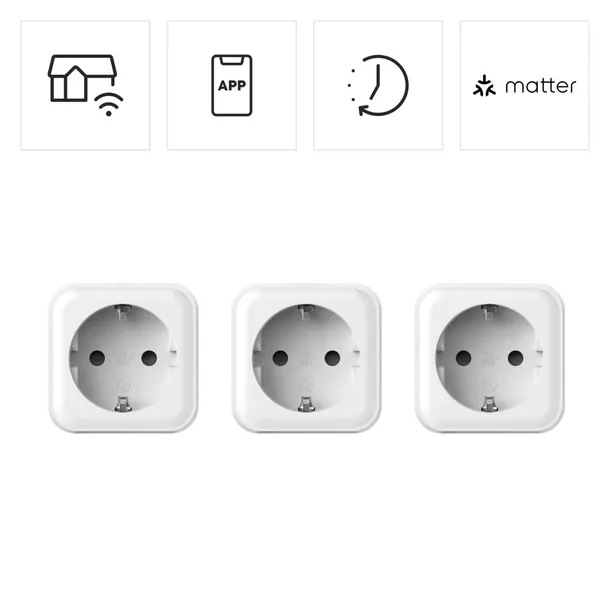 Gniazdko WLAN Hama, pakiet 3 szt. (Inteligentne gniazdko z Matter Smart Home, uniwersalne, gniazdko sterowane WLAN z aplikacją i sterowaniem głosowym, gniazdko Smart Home jako timer, 3680W)