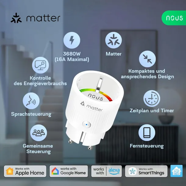 Gniazdko Smart NOUS Matter z pomiarem zużycia energii, 16A 3840W, kompatybilne z Alexą, Google Home, Tuya, Apple Home, Smart Things, zdalne sterowanie aplikacją, WiFi 2,4 GHz, IP20