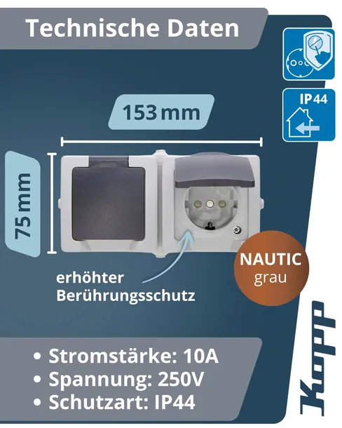- Dwukierunkowy gniazdo natynkowe 16 A, 250 V/AC, poziome, z wysuwaną pokrywą i zwiększoną ochroną przed dotykiem; idealne do piwnic, łazienek, garaży i warsztatów.