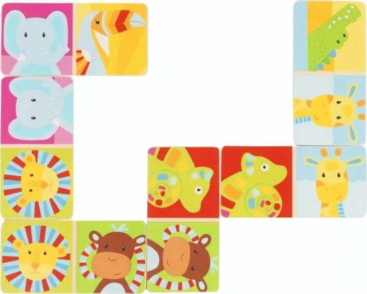 Domino to popularna gra, która polega na dopasowaniu drewnianych elementów pasujących do siebie np. żyrafa do żyrafy a krokodyl do krokodyla, tak aby stykały się ze sobą obrazkami.