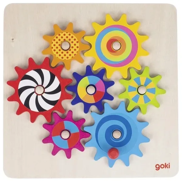 Proste wykonanie kompleksowej zabawki. Kolorowe, drewniane przekładnie mogą być układane i aranżowane na wiele różnych sposobów, aby się wzajemnie kręciły. Naucz swoje dziecko prostych zasad mechaniki, a może w przyszłości zostanie inżynierem?