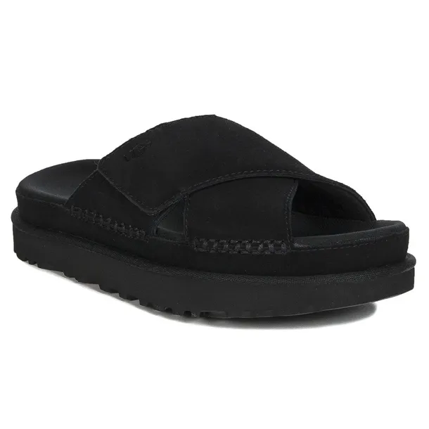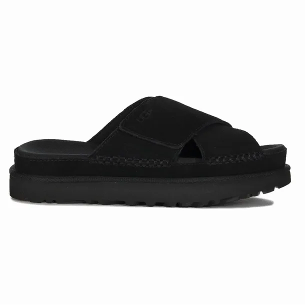 Kapcie damskie - klapki znanej z wygody, renomowanej australijskiej marki UGG to absolutny niezbędnik w garderobie każdej kobiety. Wierzch wykonano z naturalnej owczej skóry zmszowej w kolorze czarnym - Black. Całe wnętrze i wkładka wyściełane są miękką, przyjemną w dotyku tkaniną. Model z otwartym, okrągłym noskiem, posiada pasek z rzepem, dzięki czemu można dopasować klapki do stopy. Podeszwa w kształcie platformy o wysokości 4 cm to wysokogatunkowego tworzywo. Idealny model na każdą porę roku. To fason wprost dla Pań ceniących wygodę i oryginalny design.