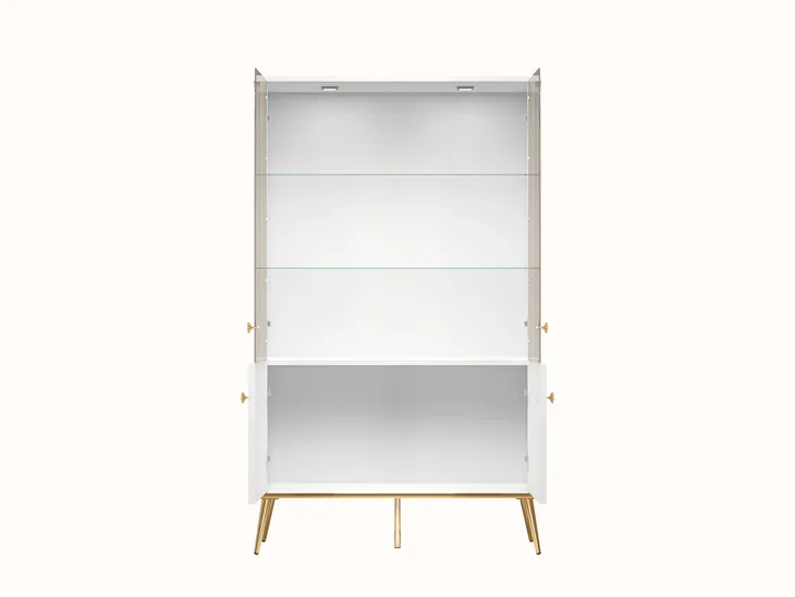 Luksusowe meble, pełne elegancji oraz połysku rozjaśnią wnętrze nowoczesnego salonu jak i sypialni. Skośne stożkowe nóżki w kolorze błyszczącego złota, idealnie komponują się z wieńcem dolnym wykończonym w tym samym odcieniu złota. Delikatne zdobienia na drzwiczkach oraz złote uchwyty stanowią dopełnienie tej pełnej kunsztu oraz szyku kolekcji.