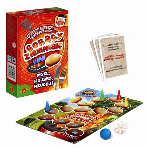 Zawartość pudełka: plansza, Gorący Ziemniak, 55 kart pytań, 4 pionki, bączek, instrukcja.