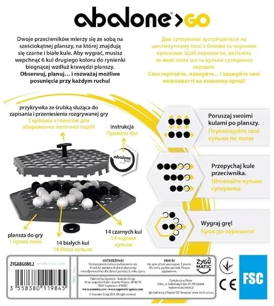 - Podobnie jak klasyczne gry logiczne takie jak szachy, warcaby czy GO, Abalone perfekcyjnie łączy proste zasady i głębię strategicznych możliwości.