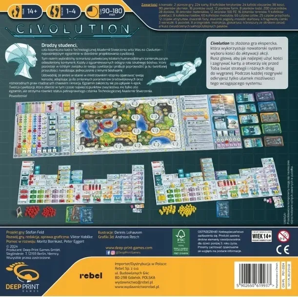 Civolution to złożona gra ekspercka, która wykorzystuje nowatorski system wyboru kości do aktywacji akcji. Udowodnij, że jesteś w stanie w mistrzowskim stopniu opanować swoją konsolę, adaptując ją do zmiennych parametrów środowiskowych oraz różnorodnych praw rządzących chaosem i kreacją. Rusz głową, aby jak najlepiej użyć kości i zagrywać karty, a otworzy się przed Tobą świat strategii i różnych dróg do wygranej. Podczas każdej rozgrywki odkryjesz tylko ułamek możliwości tego wciągającego systemu.