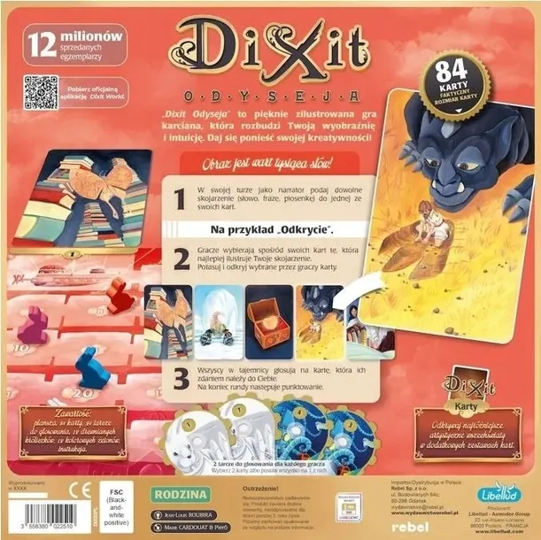 - Pojedyncze pudełko z grą Dixit (zarówno wersje podstawowe, jak i dodatki) to 84 oryginalne karty, z których każda stanowi miniaturowe dzieło sztuki. Stworzone przez najpopularniejszych ilustratorów odzwierciedlają różne style graficzne i doskonale pobudzają wyobraźnię.