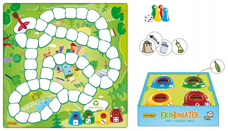 EKOBOHATER to gra, która zapewni całej rodzinie świetną zabawę i zachęci do dbania o środowisko! Wygra ten, kto jako pierwszy posegreguje i wyrzuci śmieci do pojemnika w odpowiednim kolorze.