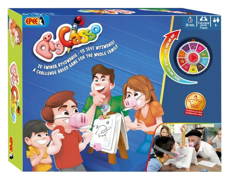 W Pigcasso gracze dzielą się na 2 drużyny. Każda z drużyn otrzymuje zabawną maskę w kształcie świńskiego ryjka, a następnie nominuje jedną osobę do wykonania w niej wyzwania. Wszystkie karty wyzwań są wielokrotnego użytku. Zakręć kołem, by wylosować kategorię, wykonaj rysunek za pomocą świńskiego ryjka i wygraj!