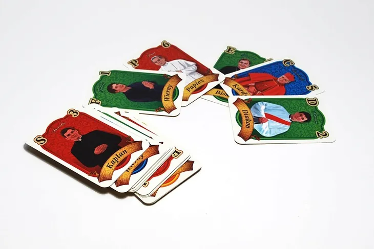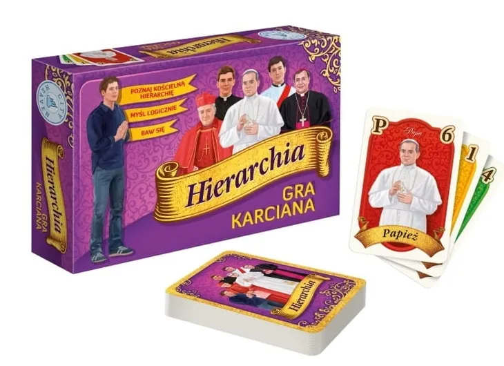 GRA KARCIANA „HIERARCHIA” TO CIEKAWA PROPOZYCJA DLA TYCH, KTÓRZY LUBIĄ SPĘDZAĆ CZAS W GRONIE NAJBLIŻSZYCH, ZNAJOMYCH I PRZYJACIÓŁ. PRZYJRZYJ SIĘ PIĘKNIE ZILUSTROWANYM POSTACIOM, POZNAJ HIERARCHIĘ KOŚCIELNĄ, LOGICZNIE MYŚL I DOBRZE SIĘ PRZY TYM BAW!