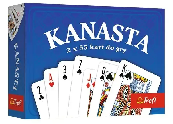 Gra karciana Kanasta od Trefl to klasyczna rozgrywka karciana, w której gracze układają tzw. meldunki — sekwencje lub zestawy trzech i więcej kart o tej samej wartości (np. trzy króle). W tej wersji gry używane są dwie standardowe talie kart, co zwiększa intensywność i możliwości strategii gry.