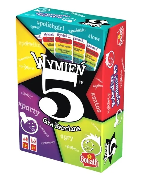 Wymień 5 to pomysłowa gra imprezowa, w której trzeba szybko znaleźć odpowiedzi na banalne pytania. Każdy potrafi podać nazwisko słynnego hollywoodzkiego amanta , ale dwa przykłady jest już trudniej znaleźć. A tym bardziej pięć! Dodatkowo -ansza, kostka i pionki aby rozgrywka była jeszcze ciekawsza. W zestawie klepsydra odmierzająca czas na udzielenie odpowiedzi.