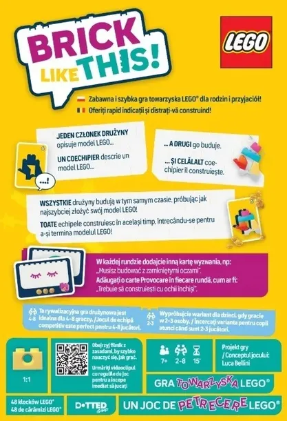 Budowanie z klocków LEGO nie ma przed Tobą tajemnic? Chcesz kreatywnie spędzić czas z rodziną? A może szukasz intrygującej i zabawnej gry imprezowej? LEGO Brick Like This to coś dla Ciebie! W tej dynamicznej grze towarzyskiej dzielimy się na drużyny, które w tym samym czasie próbują jak najszybciej złożyć z klocków kształt wskazany na karcie. Podczas gdy jedna osoba opisuje, co widzi przed sobą, druga stara się zbudować odpowiedni model LEGO. A jeśli takie zadanie jest za proste, czekają na Ciebie specjalne karty wyzwań, które jeszcze bardziej podkręcą zabawę!