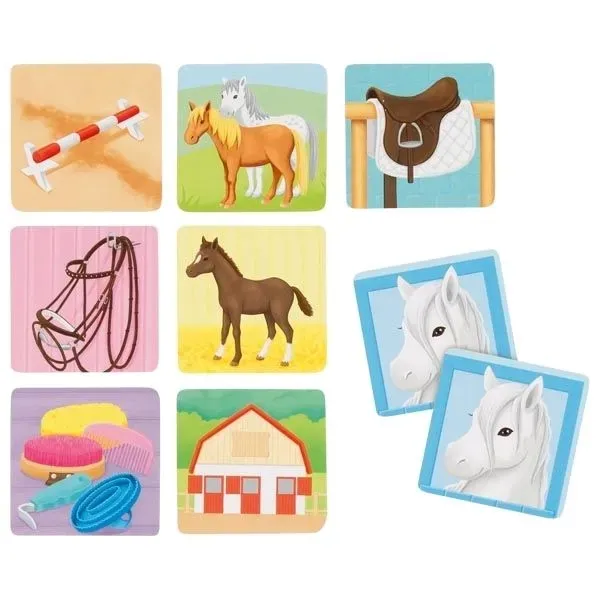 Klasyczne drewniane memory tym razem ze ślicznymi koniami oraz akcesoriami do pielęgnacji i jazdy konnej z pewnością przypasują Waszym pociechom. Solidne i estetyczne wykonanie od znanego producenta zabawek Goki sprawi, że dzieci będą chętnie sięgały po tę pozycję.