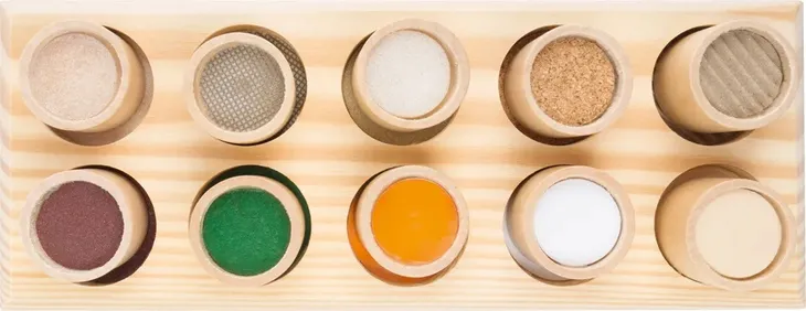 Różne powierzchnie z różnych materiałów do treningu percepcji dotykowej. Pamiętaj aby przy zabawie zakryć oczy. Na planszy znajdują się te same tekstury co na cylindrach, zadaniem jest ich dopasowanie. Świetna zabawa dla mniejszych i większych dzieci. Idealna zabawka do ćwiczeń motorycznych w żłobku lub przedszkolu.