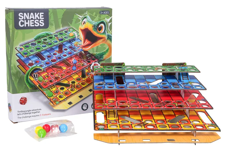 Klasyczna gra wąż i drabiny tym razem w nowej odsłonie 3D dla dzieci od trzeciego roku życia. Gra wykonana została z najlepszej jakości materiałów w żywych kolorach. Składa się z planszy 3D z 4 piętrami, kostki i pionków. W grę mogą grać dwie, lub więcej osób. Każdy gracz zaczyna od startu i przesuwa swój pionek o tyle oczek, ile wskaże kostka. Jeżeli gracz wyląduje na polu z rysunkiem drabiny, wspina się do góry, jeżeli na głowie węża ląduje na jego ogonie. Wygrywa ten gracz, który jako pierwszy dotrze do końca planszy.