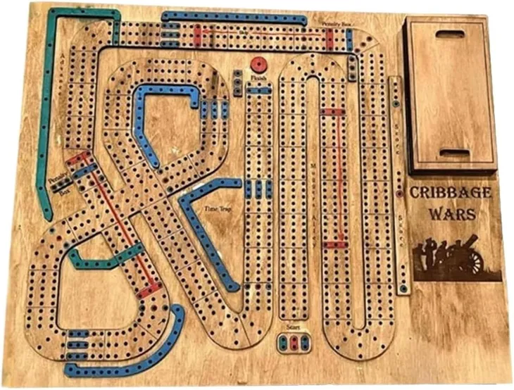 Uwielbiasz cribbage i chcesz spróbować z zabawnym akcentem? Spróbuj tego. Bierz klasyczną grę i dodaj do niej nowe, zabawne elementy. Zakrzywienie czasu, pułapki i mnóstwo zabawnych zwrotów akcji. Gra planszowa Cribbage Wars, Cribbage Boards Unique, Cribbage Boards, zestaw gier planszowych Cribbage, Cribbage Wars, drewniana plansza Cribbage z wbudowanymi w schowku na kołki Cribbage