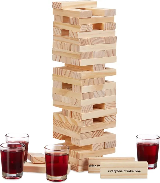 Zabawna aktywność związana z piciem na imprezy i spotkania towarzyskie Zestaw do picia z 60 drewnianymi klockami do układania i 4 kieliszkami do wódki to kreatywny pomysł na Twoją następną imprezę. Można grać w 4 osoby. To zabawny sposób na przełamanie lodów i alternatywa dla typowej rundy poznawania się. Dla większej zabawy połowa elementów gry ma wyryte zasady picia. Ta zabawna gra to rozrywkowa aktywność dla dorosłych: idealna na imprezy, urodziny, piżamowe przyjęcia, wieczory kawalerskie i panieńskie itp. Albo zaskocz swoich przyjaciół kreatywnym prezentem!