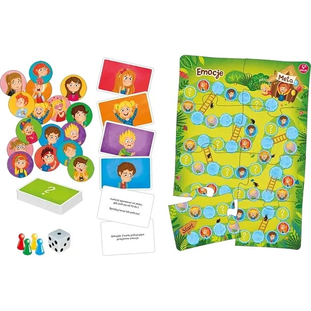 Porozmawiajmy sobie o emocjach... Tak na wesoło, ale też na poważnie. Złość, radość, niepokój, gniew, smutek, miłość... To one nami rządzą. Czasami potrafimy je ujarzmić, a czasami dajemy się im ponieść. Ważne, abyśmy je poznali i umieli o nich rozmawiać. Może dzięki temu uda się kiedyś wyjść z trudnej życiowej sytuacji. Gra „Emocje” to świetna pomoc w poznaniu siebie i swojego otoczenia. Trochę zabawy i trochę... psychologii dla każdego, dla dziecka i dorosłego.Zestaw zawiera: • 112 kart z zadaniami, • 16 okrągłych tafelków, • dużą puzzlową planszę, • dużą kostkę i 4 pionki, • instrukcję. Gra jest przeznaczona dla dzieci od 7 lat. Wymiary opakowania: 24.5 x 22.0 x 4.5 cm