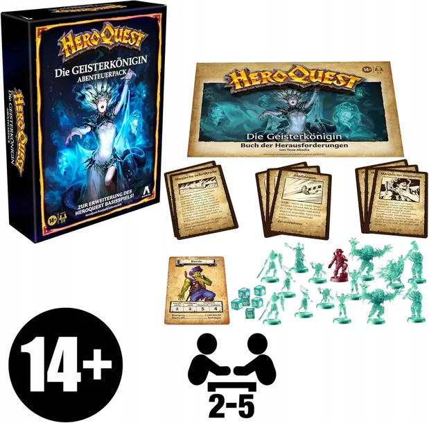 - punkt znaku wypunktowania: ROZSZERZENIE GRY : Pakiet zadań Spirit Queen's Torment (Męki Królowej Duchów) to rozszerzenie systemu gier HeroQuest, który był dostępny tylko w pakiecie HeroQuest: Haslab Mythic Tier Package (wymaga systemu gier HeroQuest do gry. Sprzedawane oddzielnie.), KONTYNUJĄCA PRZYGODA : Bohater bard ujawnia zakłócenia w świecie duchów, a gracze muszą odnaleźć królową duchów, aby powstrzymać diabelski plan Zargona! 15 kart gier i Księga zadań zawiera ilustracje, które przyczyniają się do zanurzenia graczy w świecie zagrożeń, Rozszerz swoją kolekcję FIGURIN: To rozszerzenie gry zawiera 33 szczegółowe figurki (nie malowane), takie jak bohater bard i figurki turkusowych potworów, Zawiera 14 ekscytujących zadań : Księga zadań Duch Queen's Torment, napisana przez Teos Abadia, zawiera 14 zadań w niebezpiecznych miejscach pełnych potworów, skarbów, zaklęć i ukrytych magicznych sekretów, GRAJ SIĘ W NIESKOŃCZONY: Gracze zanurzają się w świecie HeroQuest z tym rozszerzeniem, które dodaje możliwości gry Gracze mogą również tworzyć własne historie i zadania