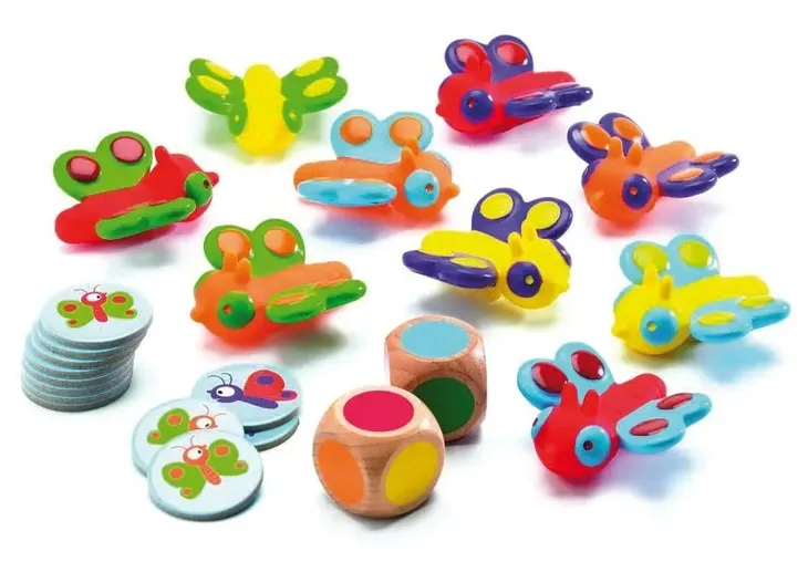 Zadaniem dziecka jest rzucić dwoma kostkami naraz i jak najszybciej odnaleźć motylka w kolorach które wypadły na kostkach. Duże drewniane kostki, śliczne gumowe motylki, którymi po zakończeniu gry dziecko może się dowolnie bawić.