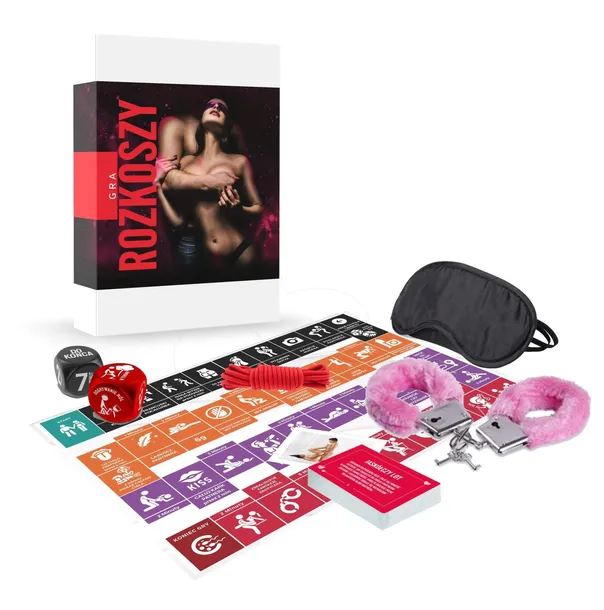 Zawartość :Kajdanki z futerkiem, gra karciana z pikantnymi zadaniami, karty z fantazyjnymi pozycjami, opaska na oczy, , sznur do krępowania, 2x kości miłości do losowania sex zadań