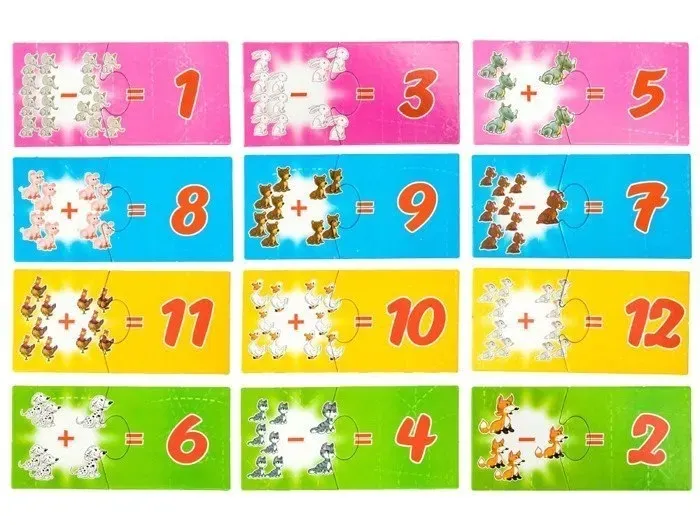 Gra SPINKI Dodawanie i Odejmowanie to idealna układanka dla każdego przedszkolaka. Świetnie łączy naukę z dobrą zabawą.Jeszcze nigdy matematyka nie była tak zabawna! Poprzez skojarzenia poszczególnych elementów, maluchy dobierają części układanki w całość. Zabawa polega na połączeniu puzzla przedstawiającego zwierzątka z działaniem matematycznym, z puzzlem na którym jest cyferka z wynikiem tego działania.