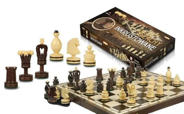 Zestaw drewanianych szachów. Zamykana skrzynka umożliwia przechowanie wszystkich figur.Figury ozdobione są paskami miedzi. Wymiary planszy po rozłożeniu: 49 x 48,6 cm Wysokość pionka: 5 cmWysokość figury: 9,5 cm Wymiary opakowania: 51,5 x 26,5 x 5,5 cmWiek: +7Liczba graczy: 2