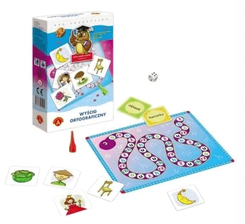 W grze "Wyścig ortograficzny" wygrywa ten, kto najszybciej odnajdzie, wśród tabliczek leżących na stole, obrazek zawierający w nazwie literę z pola, na którym zatrzymał się pionek. W trakcie zabawy dzieci poznają i utrwalają sobie właściwą pisownię wyrazów z "rz", " ż", "ch", "h", "ó" i "u". Gra jest również świetnym treningiem spostrzegawczości i refleksu dla młodszych i starszych graczy.