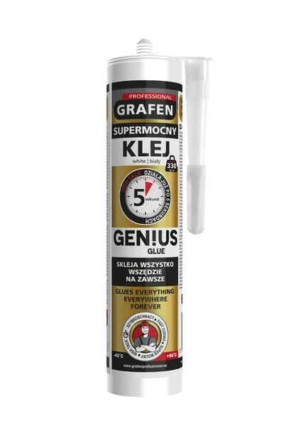 Grafen Genius Glue to jednoskładnikowy, wszechstronny klej hybrydowy charakteryzujący się bardzo dużą siłą klejenia wstępnego (trzyma już w 5 sekund, z siłą nawet do ponad 330 kg na m2).