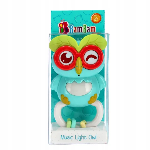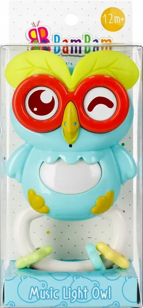 GRAJĄCA SÓWKA - to unikalna grzechotka z opcją wygrywania 12 melodyjek oraz nagrywania własnych kompozycji. Krótkie naciśnięcie brzuszka sówki uruchamia jedną z 12 kołysanek, a dwukrotne naciśnięcie umożliwia nagranie własnych dźwięków. Przytrzymanie białego przycisku ponad 5 sekund umożliwia skasowanie nagrania. Sówka osadzona jest na obręczy, na której znajdują się kolorowe kółeczka o nieregularnym kształcie. Potrząsanie zabawką wprawia je w ruch, implikując dźwięki uderzania po sobie. Zabawka doskonale sprawdza się w ćwiczeniu umiejętności manualnych dziecka, pobudzania jego wyobraźni oraz wspierania rozwoju zmysłu słuchu, wzroku, dotyku. Wymiary/waga/baterie: wymiary produktu dł. x wys. x gł. cm : 8x14x5, wymiary opakowania dł. x wys. x gł. cm : 8x18x5, waga produktu bez opakowania kg : 0,10 kg, waga produktu w opakowaniu kg : 0,15 kg, wymaga zasilania bateriami 2 x AAALR03- załączono do zestawu. Zabawka przeznaczona dla dzieci w wieku: 12m . Pakowana w przeźroczyste opakowanie z zawieszką.