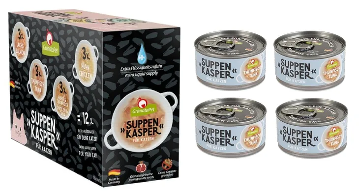 Mokra karma GranataPet Suppenkasper z tuńczykiem, wysokiej jakości delikatny bulion z dużą ilością soczystych kawałków mięsa zachwyci każdego kota. Pyszna zupa pomaga kotom optymalnie pokryć dzienne zapotrzebowanie na płyny. Czy to jako przekąska, dodatek do posiłku, czy też jako zaspokojenie głodu pomiędzy.