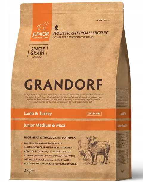 Pakiet Grandorf Lamb & Turkey Junior Medium & Maxi Breeds Karma Dla Juniorów Średnich i Dużych Ras 3 kg + Kubek z Twoim Pupilem GRATIS!GRANDORF LAMB & TURKEY JUNIOR MEDIUM & MAXI BREEDS KARMA DLA JUNIORÓW ŚREDNICH I DUŻYCH RAS 3 KG