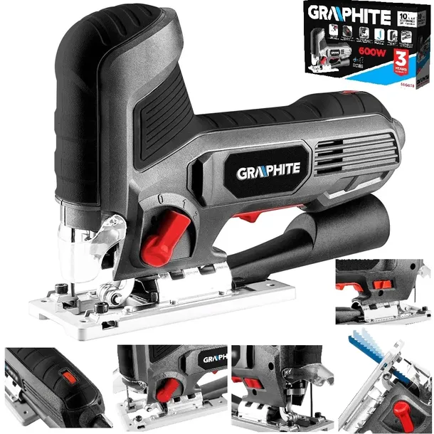 - Wyrzynarka 600W, ilość suwów 800-3000 min-1, z uchwytem za korpus marki GRAPHITE polecana jest profesjonalistom oraz zaawansowanym majsterkowiczom.