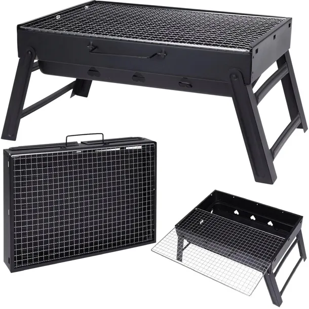 Składany grill ogrodowy wykonany ze stali nierdzewnej malowany na czarny kolor. Wyposażony w dolny ruszt na węgiel oraz uchwyty po bokach ułatwiające przenoszenie.