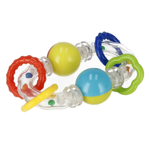 Dodatkowe elementy, takie jak obracające się kuleczki we wnętrzu grzechotki, kolorowe krążki oraz kule na obręczy uatrakcyjniają zabawę.