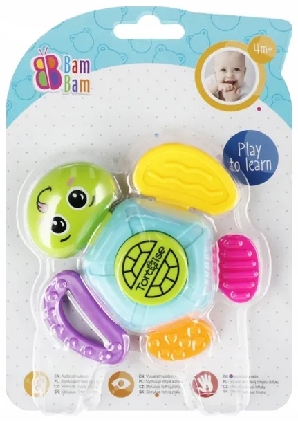 Kolorowa Grzechotka Żółwik BAM BAM przeznaczona dla niemowląt od 3 miesiąca życia. W intensywnej kolorystyce, o zróżnicowanej fakturze materiałów i róznorodnej formie wypustek na płetwach zachęcająca malucha do zabawy,   jednocześnie stymulując rozwój zdolności manualnych oraz    zmysłów dotyku, wzroku, słuchu oraz zdolności przycisk, wyzwalajacy dzwięk, stanowis dodatkową atrakcjję aktywizującą zmysł słuchu. Grzechotka, dzieki miękkim silikonowym płetwom, może być takze doskonałym remedium w okresie ząbkowania, przynosząc ulgę obolałym dziąsłom maluszka.