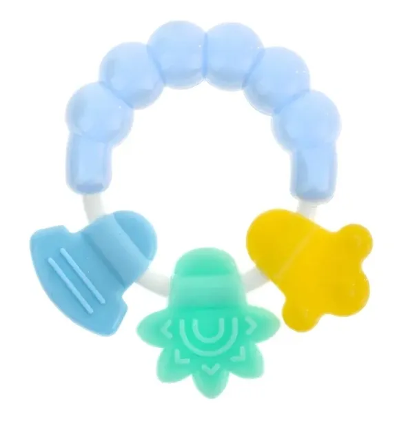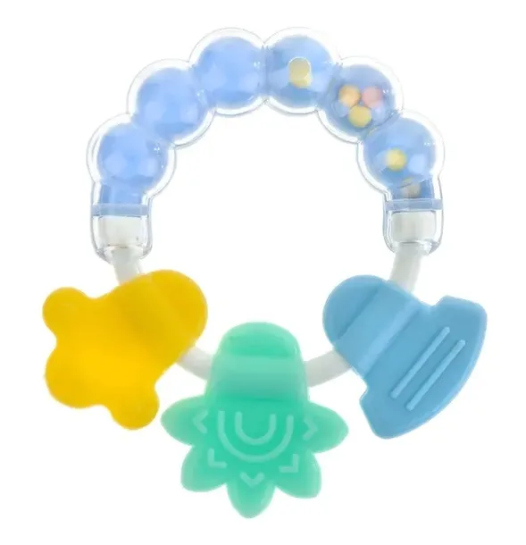 Grzechotka z gryzakiem łączy w sobie zalety gryzaka i grzechotki, gdyż pokryta jest gumową warstwą z wypustkami, niosącymi ulgę ząbkującemu maluchowi. Dzięki ciekawej kolorystyce wspomaga rozwój koordynacji wzrokowo-ruchowej dziecka. Specjalnie dobrany kształt sprawia, że grzechotka jest wygodna do uchwycenia i utrzymania w małych rączkach.